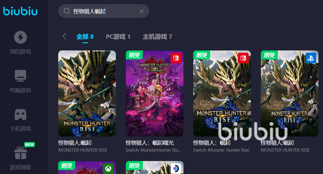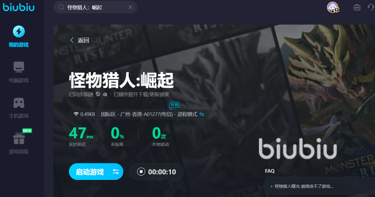 怪物猎人崛起是biubiu加速器可以加速的游戏之一,玩家在加速怪物猎人崛起的时候,如果自己电脑上有这款游戏的话,在biubiu的可以检测出游戏,用户可以直接进行游戏加速。