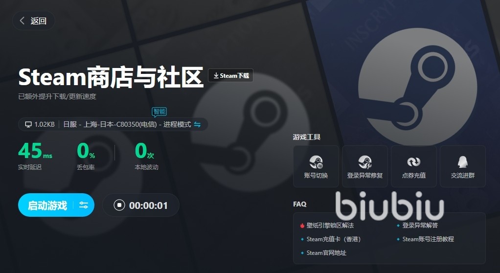 在steam平台上,用户能够去购买各种不同的游戏,并把它们直接下载到个人电脑上进行安装和体验,此外该平台还拥有庞大的用户社群,让玩家能够在其中进行游戏的讨论,其中就包括了经验分享和上传截图与制作游戏指南等,所以它的人气一度都是非常的高,而大家在实际的使用过程中如果网络链接状况不佳就很难受了,所以这个时候就需要去通过加速器来稳定运行,其中biubiu就是个不错的选择。