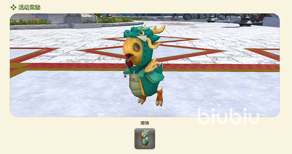 故事的设定也很简单,这位NPC想传递东方文化,但是自己的吉祥物未受好评,于是委托玩家帮助他去调查,之后你只需要跟着故事去跑腿就行了,没有战斗和解谜的过程,基本上都是由过场动画和文本来演绎。为了贴合世界观设定,游戏将十二生肖解释为神明,在每年农历新年的这个时候都将选出一个新的主神。在活动剧情完成之后你将会得到一只宠物,它是一个将自己打扮为龙的迷你陆行鸟。
