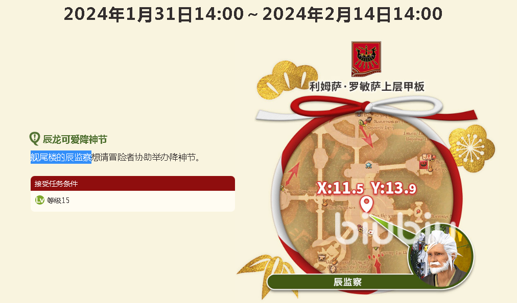 降神节一般指农历新年,是一个比较小的活动,因为《最终幻想14》本身没有对原版进行大规模修改,而日本一般也只过农历新年,所以这个节日活动非常简短。玩家只需要去被称为海都的利姆萨·罗敏萨的上层甲板,在指定坐标找到位于舰尾楼的辰监察开启对话就能开启这个小任务,2024年该节日的任务将会在1月31日到2月14日限时开启。
