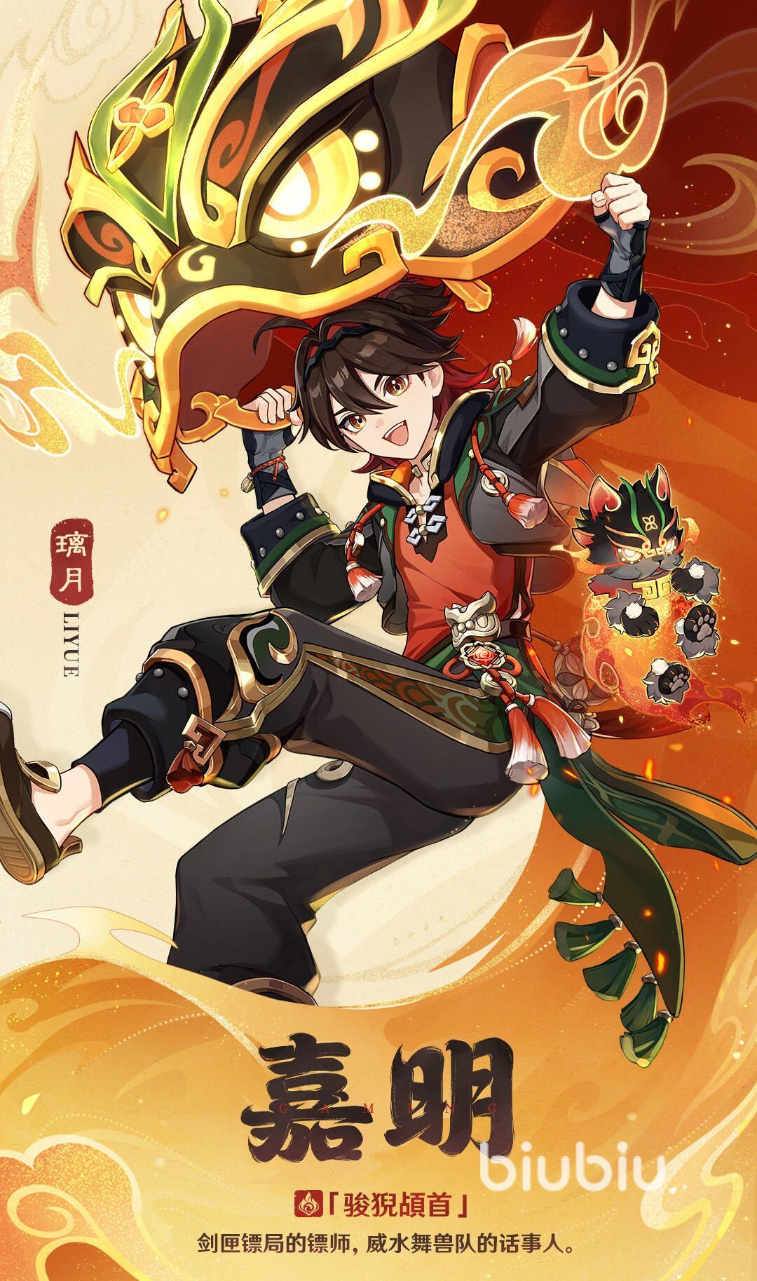 嘉明是璃月剑匣镖局的年轻镖师,同时也是威水舞兽队的话事人,他会在4.4版本的活动剧情中首次和玩家见面。作为四星角色会4.4上半进行UP,但值得一提的是四星角色的他抽取难度并不是很高,毕竟游戏的四星是10连一个保底,玩家可以在尝试抽取五星限定人物时顺便将他抽出来。