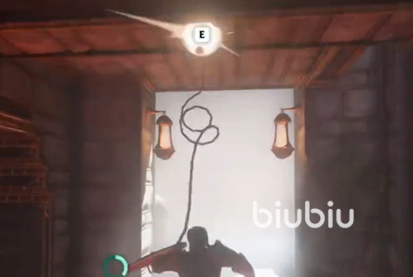 解锁后我们直接向右边走,同样利用台阶和铁网来到上面一层,到达间隔处时可以使用钩索飞到对面,之后往前走便发现第二个机关了。随后我们向右上方继续前进来到外面露台,绕外面一圈从绿色的大门再次进入,越过倒刺便可到达最后一个位置。