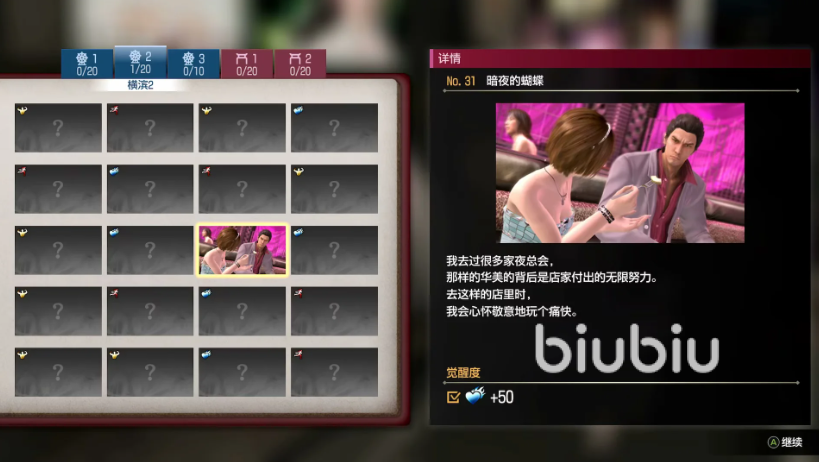 游戏里正式的翻译叫做“死前日记”,简单来说就是将没有完成的事都记录下来,在临死前了却心愿。游戏中除了主线的几个事项之外,还将一些额外事项设定成玩法,其中一部分为回忆一部分为桐生一马的专属支线,在小地图上以书本的标识显示这些事项,每完成一个就会解锁照片,并且会略微提升桐生一马的各项属性。若你想让昔日的东城会第四代会长恢复巅峰实力,别忘了和队友们完成这些内容。