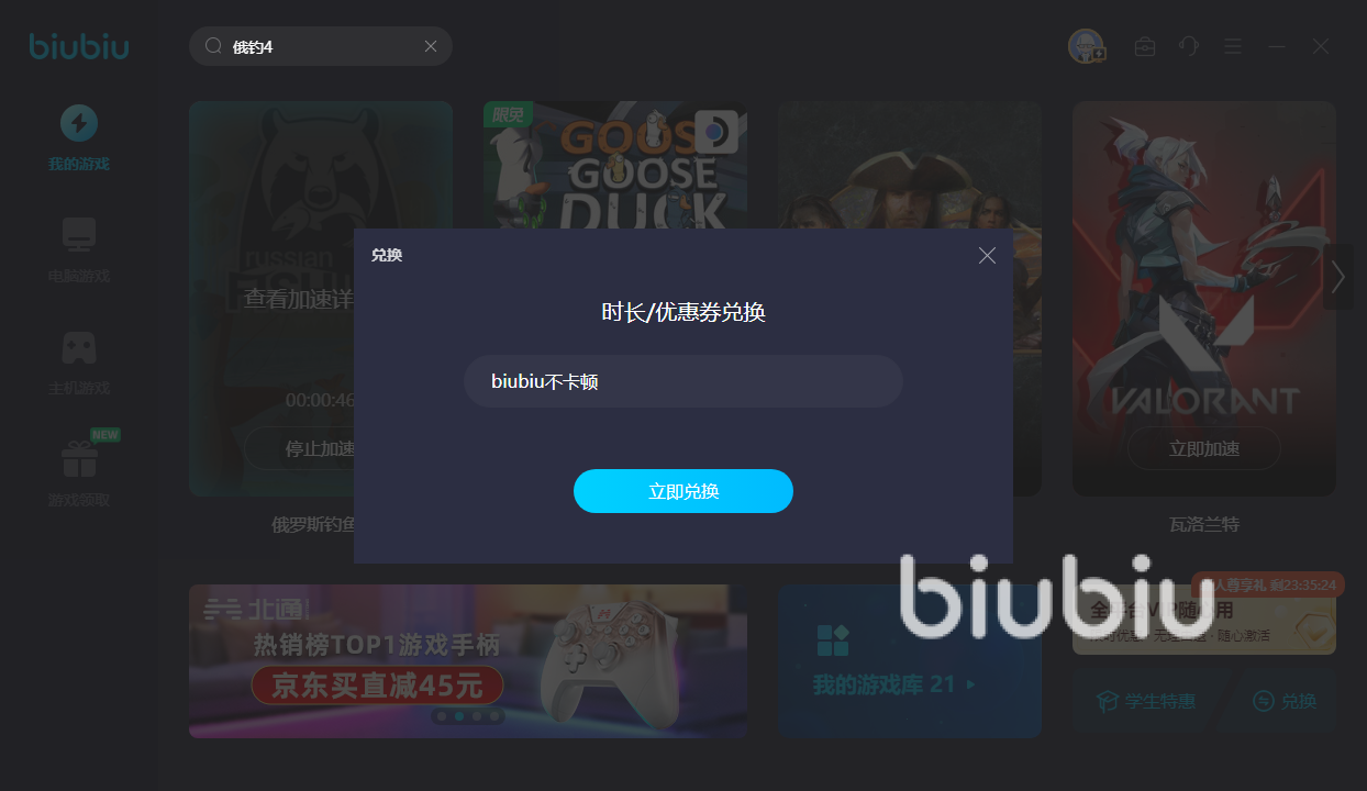 Biubiu在制作开发的时候保持体量设计也是比较小的,在开启之后不会占用你很多的虚拟内容,可能连10m的流量都占据不到,但是能给你的网速带来飞一般的体验,而且大家也是不难看出,对俄钓4这种游戏来说只是喜欢钓鱼人的一种宝藏,但biubiu却依然给收录了进来,想要找其他几代版本一样也很简单,它的资源库搜索引擎是很强大的,如此多的游戏加速收费还很便宜,新用户首次注册能领取24小时免费加速,后续新老用户再去输入兑换码【biubiu不卡顿】还能得到72小时免费加速。
