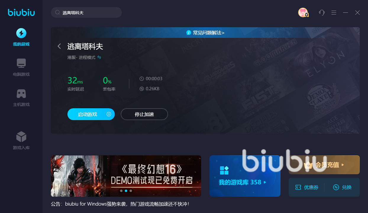 biuibiu加速器不仅仅支持pc游戏,对于手机swich,xbox等各大平台的游戏也是可以提供加速服务的,熟悉的伙伴应该都知道加速器上边还有一个超级丰富的游戏库,这里边有各种各样的游戏,很多的国服游戏都开启了限免的服务,喜欢的伙伴都是可以去尝试下的。另外每款游戏都是有对应的社区,每天都会有很多的伙伴来分享自己的通关攻略,所以新手的用户可以都去哪里跟其他的伙伴沟通交流下,不管怎么说前期都是不需要缴费的,足够让玩家们去了解这款加速器的功能和优势,关于逃离塔科夫加速器推荐跟大家聊到这里就彻底结束了,感谢大家的观看。