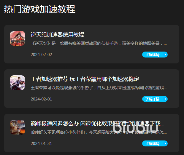 想要了解更多关于软件的使用方法还可以到官网去浏览加速教程,官网为大家把加速教程都分类好了,不同游戏的加速教程一搜就有。除了教程以外还有很多游戏攻略可以查看,如果想要回帖的话则到社区去跟其他玩家发帖交流,氛围十分和谐。