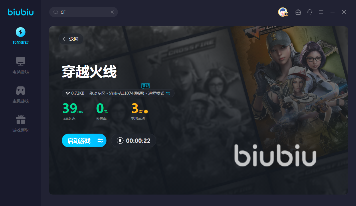 Cf穿越火线这款游戏最大的特点就是拥有非常炫酷的角色和枪械皮肤,这里面的枪械数量随着不断更新越来越丰富,同时出现的还有大量神话武器以及不同武器外观皮肤。这些共同组成了现在游戏中的复杂武器系统,再加上还有其他战术道具应用,以及不同模式下不一样的战术和配合,所以整个体验极其丰富。喜欢竞技的玩家可以去暴富模式或者是团队竞技一显身手的喜欢展现个人技术,也可以去个人竞技中大杀四方,绝大多数玩家都可以在这里找到适合自己的玩法。但无论选择哪一种,优质网络都是极其必要的,很多玩家经常出现卡在登录界面或者是进入房间后延迟高的情况,这些都能用biubiu来解决。