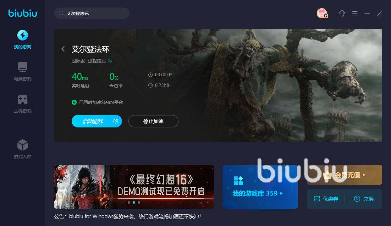 2024年02月06日 17:02 来源:先锋本火恐龙艾尔登法环这款游戏中的关卡非常的有意思,所以深受广大玩家的喜爱和追捧,但是最近发现喝多的玩家在体验的时候都会遇到各种各样的网络问题,那么艾尔登法环卡顿怎么办呢?就让小编来给大家介绍一款好用的biubiu加速器吧,通过加速器可以帮助大家优化当前的网络问题,从而享有更快的运行速度,操作起来也十分的简单。