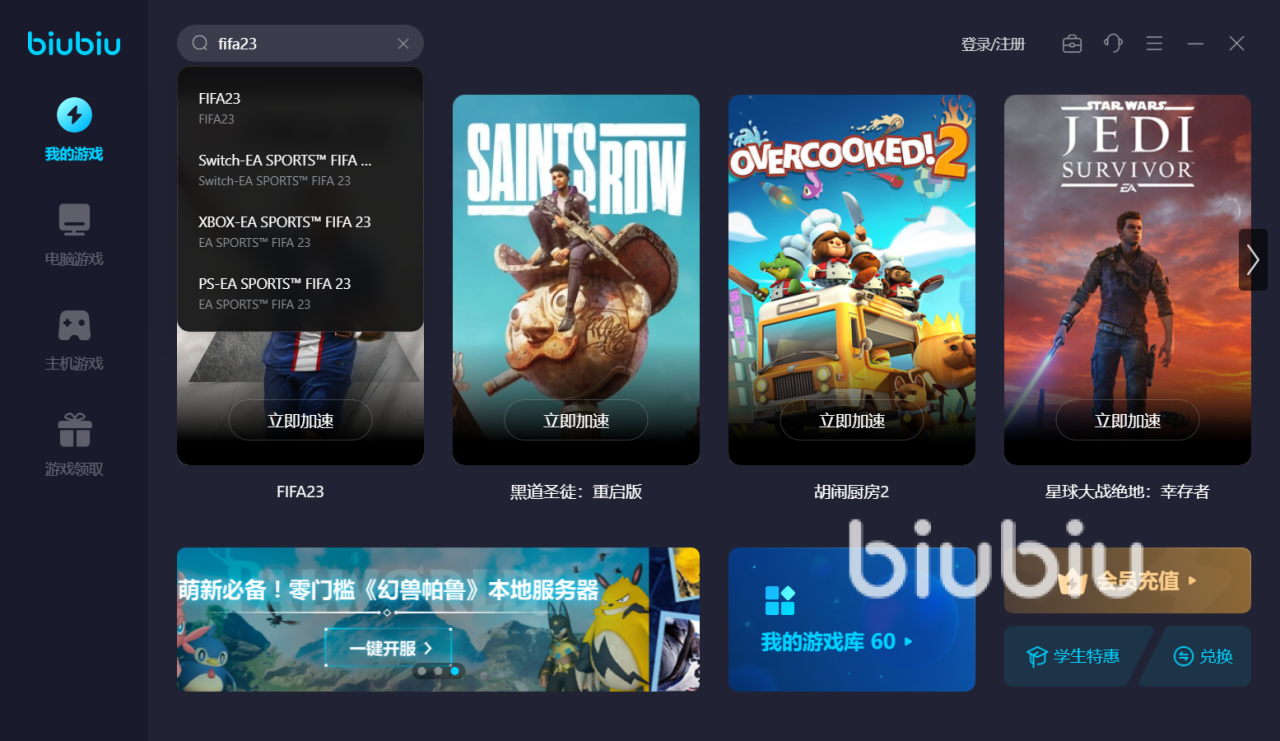 第三步,使用加速。biubiu一键加速和关闭加速,整个操作步骤一气呵成,没有多余的步骤,实现智能化加速,新手小白用户也能马上上手,玩家们在游戏库中搜索游戏,找到fifa23,立即加速。
