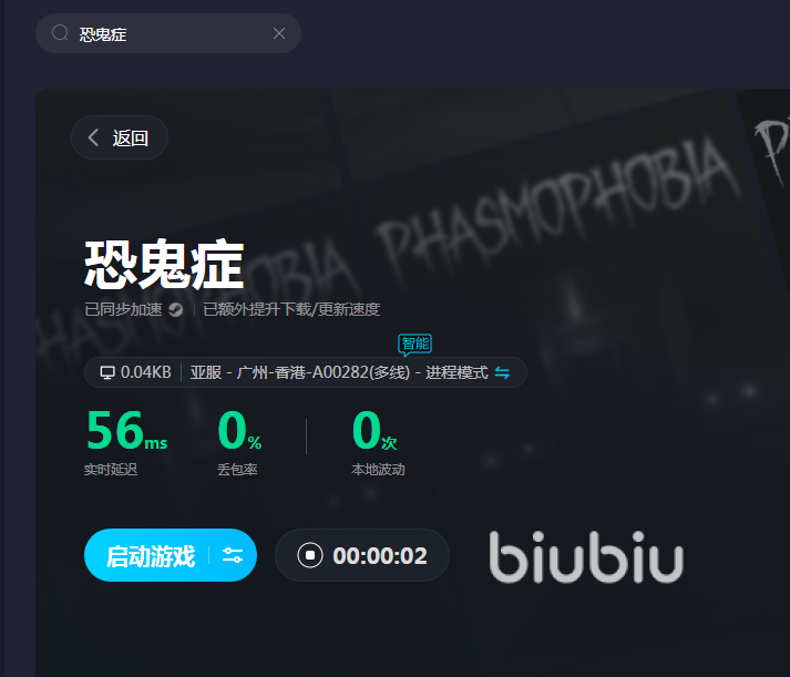 在下载加速器以后,可通过主页搜索引擎找到恐鬼症,接着点击开始加速即可。可以对上千款游戏进行加速,市场上面的绝大多数游戏都可以在这里找到,为了用户体验起来方便,还把一些热门游戏放到专栏方便寻找。支持多端口的同步加速,完全不用担心随意切换之间影响网络,改善登录困难和经常掉线,让你玩外服游戏也能顺畅登录,是你们体验恐鬼症游戏的好帮手。