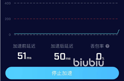 点开始加速biubiu就行动起来了,快速的开启服务状态,优化大家的网络,将延时降低下来,可以看到加速前后的延时差别是很大的。此时进入游戏,就会明显看到右上角的延时数值很低,这就代表玩家可以尽情地游戏了。