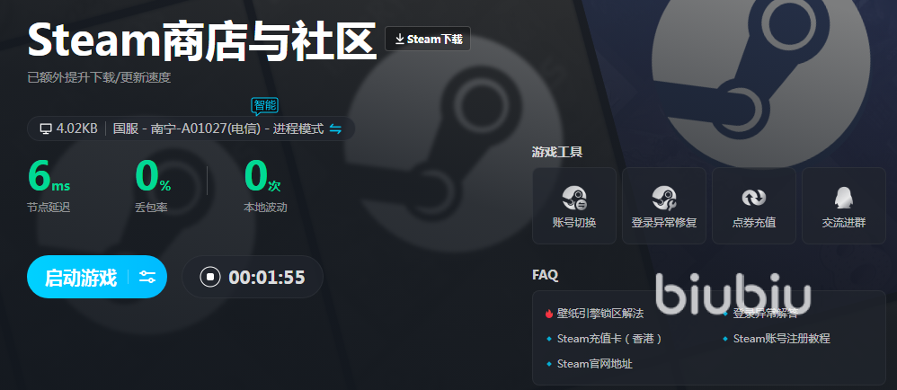 小伙伴一边加速还能一边了解流量情况,网速的数值是实时显示的,既有下载速度又有延迟率,看到这些稳定的数值大家玩游戏心里也能安心很多。它在加速steam的时候旁边还会显示一些小工具,方便大家切换账号、修复登录异常。