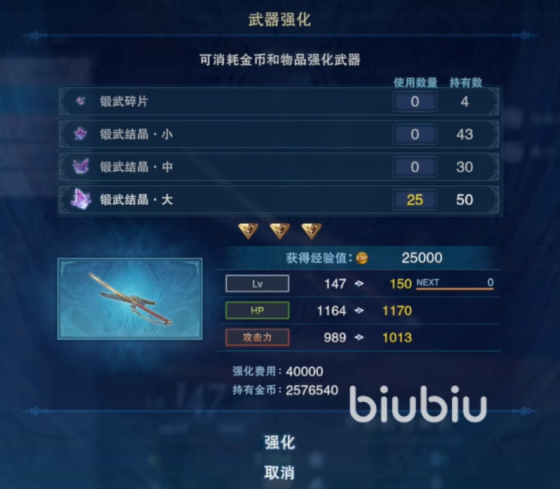 锻武系列材料顾名思义就是强化武器的,玩家可以去当前城镇的铁匠铺进行对话,然后使用这些材料来强化武器,提高武器的等级和伤害面板数值。锻武材料后面的大,中,小对应着强化所给予的经验,给的最少的是锻武碎片,强化等级越高需要的锻造经验也就越多。