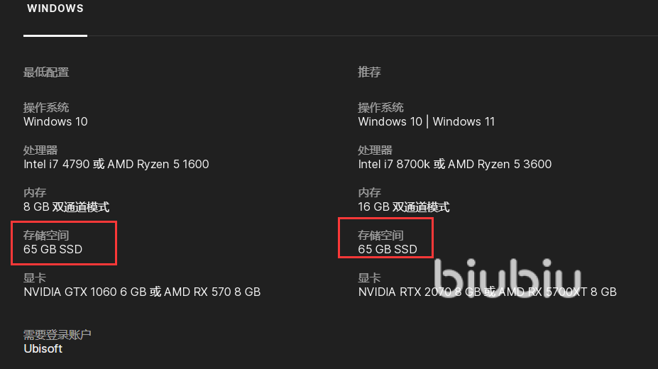 碧海黑帆上线了多个平台,这里先给大家分享下PC平台的容量大小作为参考。从游戏的配置页可以看到,这款游戏需求的存储空间为65GB,这里还特别强调了要使用SSD,也就是固态硬盘。