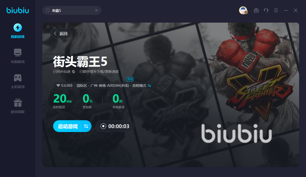 由于街霸五暂且木有国服,所以为了进入游戏页面,还得利用biubiu加速器。用起来也很简单,仅需一键即可设置好对应的网络节点。若是玩了几把想要休息一下的话,即可点击一下暂停,便可为其他游戏加速,非常容易!如果是新用户的话,还能获得24H的免费加速,无偿感受一下这种加速快感!新老用户还可输入【biubiu不卡顿】,就能继续享受三天免费加速,让你玩得乐此不疲,从此爱上biubiu!