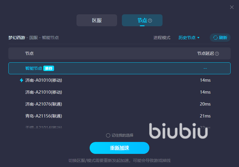 梦幻西游国服的延迟水平不像海外有那么高,但延迟这种东西自然还是追求越低越好,尤其是在开新区玩家数量特别多的时候,要是你自己的网络本身就比较差,过高的延迟可能就要比其他玩家体验起来差很多,在开启biubiu之后延迟是怎样的水平一眼就能看出,且大家平均的延迟平时在游戏里是看不到的,可在加速之后你就能在加速器的主页里面看到,同时还会告诉你的加速线路来自于哪一个城市,要是觉得加速效果还有可提升的地方,大家也能根据自己的理解去更改一下线路。