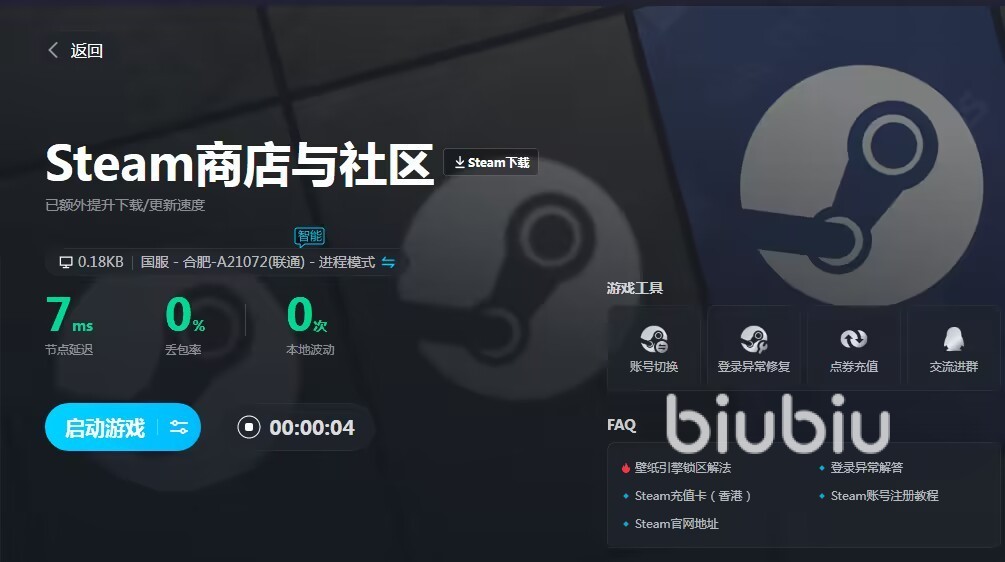 由于steam的服务器在美国,直连的时候会出现打不开页面的情况,而biubiu在全世界都准备了加速节点,能为我们提供稳定、快速的网络环境,并且它还能让我们下载游戏的全程保持不断流,并提升500%的游戏下载速度。