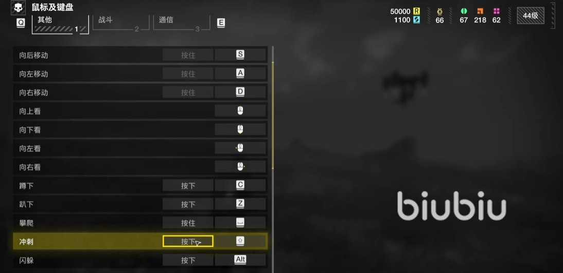 然后是鼠标键盘,这里主要给大家介绍一下更改键位绑定,在里面找到【冲刺】,你可以改成【按下】。因为玩这个游戏,你要经常的冲刺,使用左手的频率实在是太高了,你把冲刺改成按下,那么就可以解放一下自己的左手小拇指了。