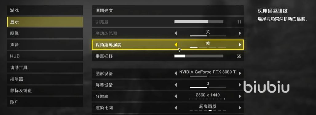 然后显示界面里面有一个【视角晃动强度】默认好像是适中,如果不改它,正常我们召唤出来补给镜头是有一个剧烈的晃动,会让你玩这款游戏的时候更有战争的沉浸感。如果你把这个选项设成了关,那每次装备落地的时候就没有那么强烈的镜头摇晃了。这里个人推荐大家把动态模糊关掉,这样玩起来就没有那么强烈的眩晕感,剩下的选项大家都根据个人电脑的情况自己去调整就好了。