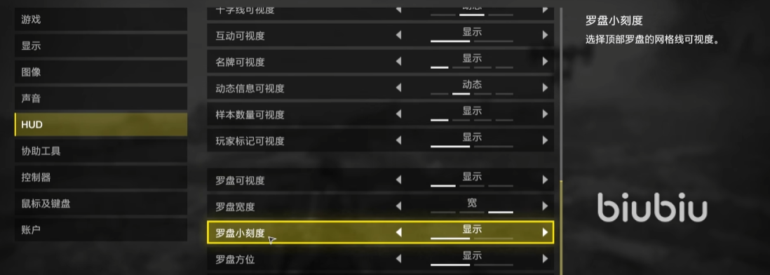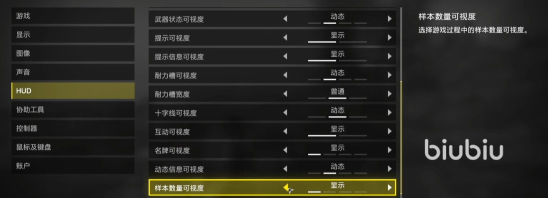 声音界面大家自己可以简单看一下即可,接下来看一下HUD的选项,找到【样本数量可视度】,把它改成【显示】。改完之后大家可以看右上角的图标里,会有常驻的样本数量显示,不用再开地图键去找样本还剩多少。然后就是HUD里面的,你可以从中找到罗盘可视度,罗盘宽度、小刻度方位和角度范围,都像下图这样改就可以了。