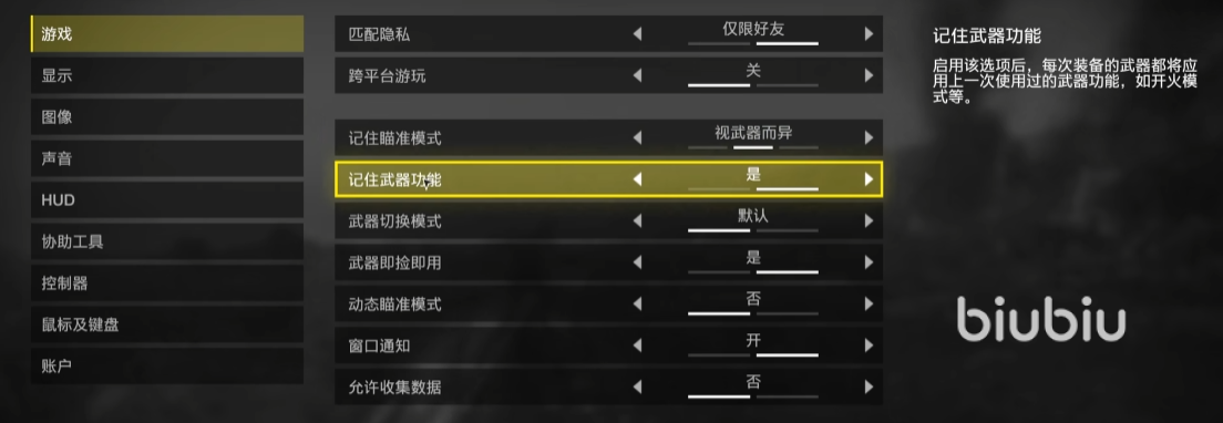 【记住武器功能】要选【是】,启用该选项后,每次装备的武器都将应用上一次使用的武器功能,如开火模式等,这个选项这样改后,可以保留我们每把武器的开火习惯,后面玩的时候就比较方便。而【武器切换模式】默认就行。