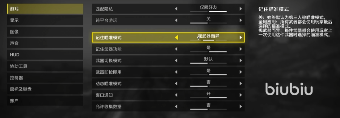 首先打开设置游戏这一栏,里面有个【记住瞄准模式】,这个要改成【视武器而异】。如果是默认,举枪就是第三人称的瞄准模式,那么全局应用会更改每一个武器的瞄准模式,而我们每个武器的应用场合不同,有些需要远距离开镜瞄准,有些需要近距离快速清场,所以改成视武器而异,会让我们每件武器保留上一次使用这个武器时的瞄准模式,不需要太多多余的操作。