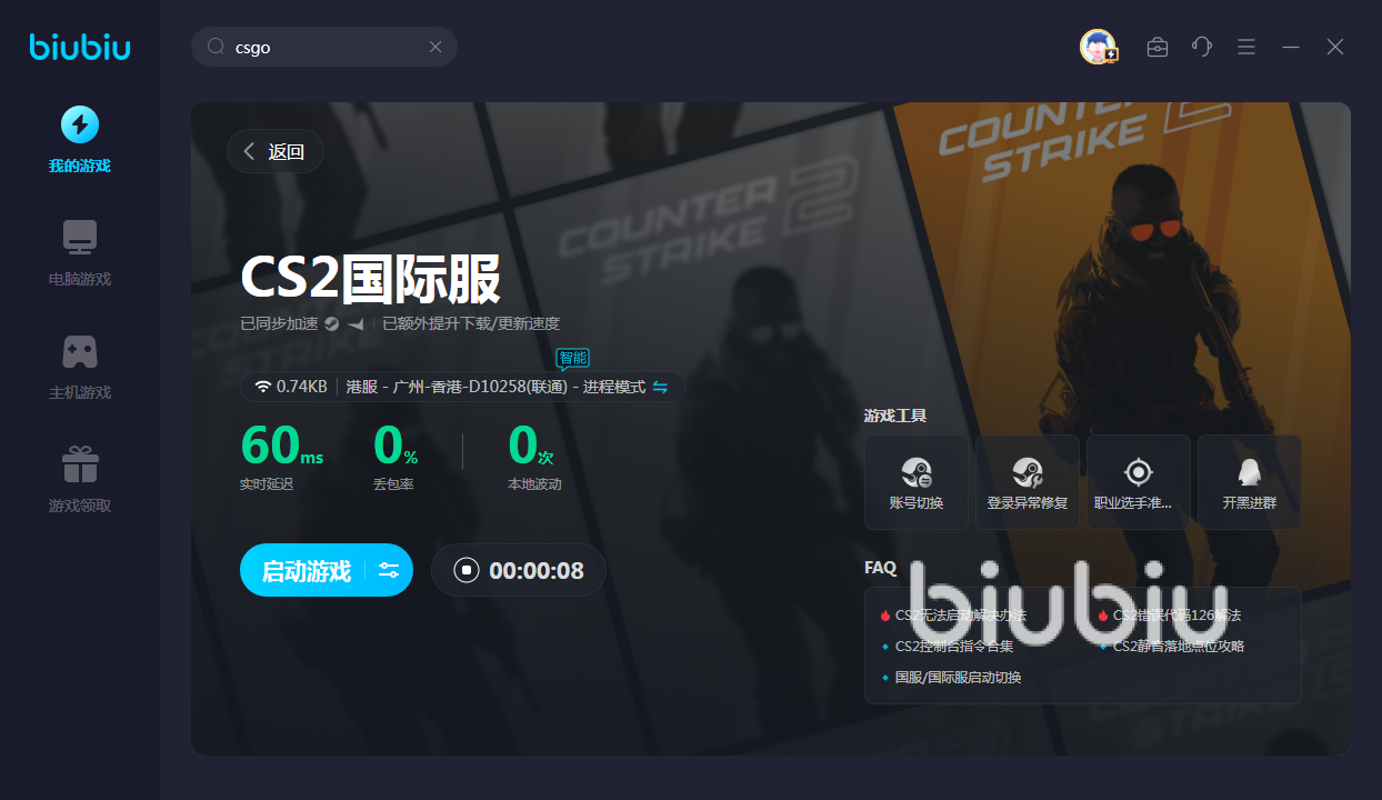 之前csgo玩家可以免费通过更新的方式升级到新版本,也就是cs2,大家无论搜索CSGO还是cs2,找到的都是同一款游戏,在进行更新之后,画质方面达到了更加出色的效果。游戏基于高级引擎打造,具备了更加逼真的渲染效果和先进的网络,对社区创意工坊工具等方面也进行了升级,赋予玩家更加出色的体验。玩家虽然在游戏中获得了更好的射击玩法,但是也有普遍吐槽的地方,那就是在优化方面做的不尽如人意。大家经常会发现出现帧数下降,卡顿等问题,还有延迟过高,直接影响射击和走位。这时利用biubiu加速器就可以解决,不仅能够优化游戏网络,还能够帮助大家跨服。