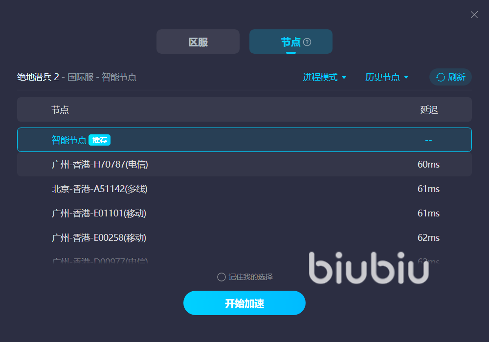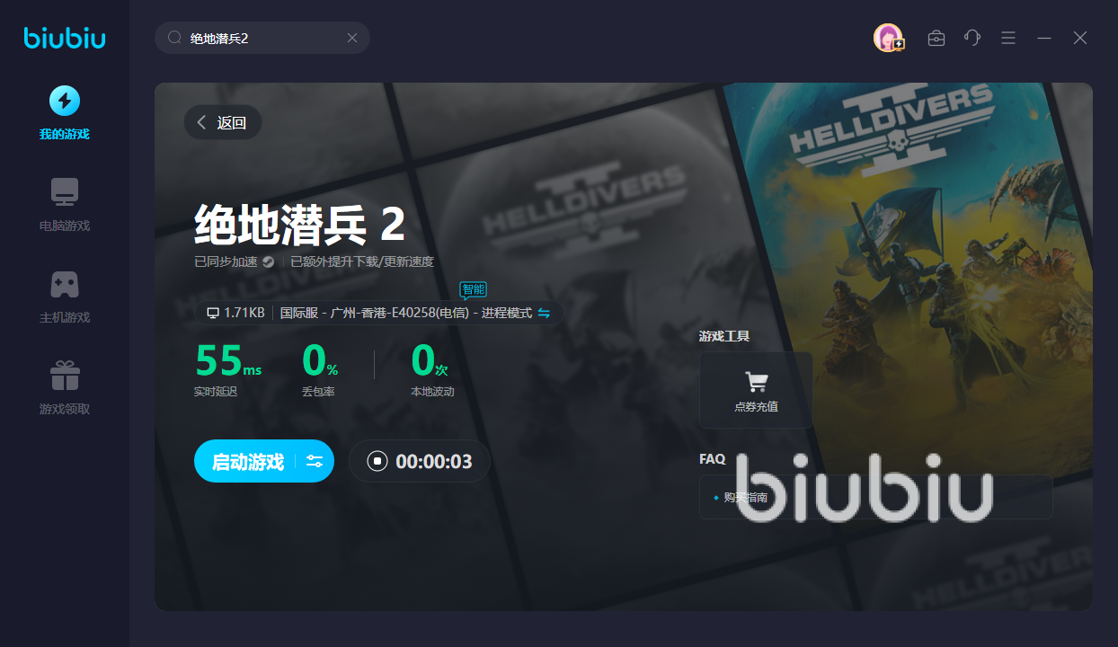 小编建议大家体验这个游戏用biubiu加速器,帮助你们流畅体验,界面也比较简洁易用,让各位用户都能轻松使用。可以直接通过搜索引擎找到你想加速的游戏,就比如本期文章提到的绝地潜兵2你就可以直接搜索,然后需要大家来选择区服了,国际服、港服、日服、美服、澳服等等都应有尽有,选择你体验的对应区服点击就可以进行加速了。像大家经常体验和搜索的游戏就会直接放到我的游戏栏目内,方便你的下一次加速与寻找。