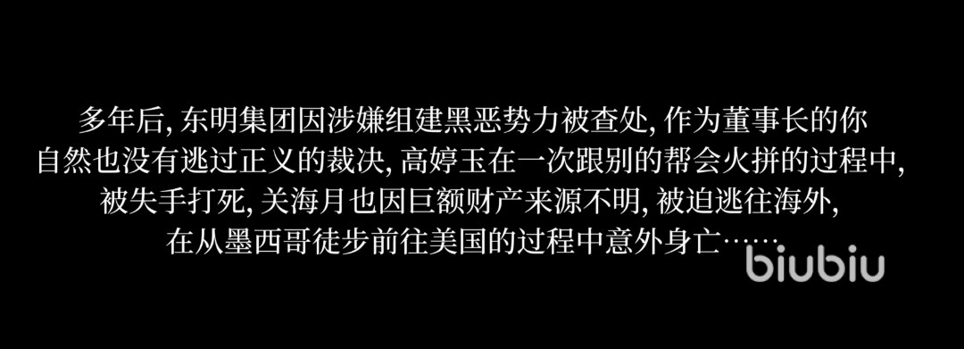 这个章节的内容延续上个章节的复仇内容。你和npc高婷玉的计划顺利进行了,人物史大强和廖思扬决裂了,但是廖思扬再次逃跑打乱了你们的计划,你又重新设计引出了廖思扬,在面对选择时如果选择了【三千万】,触发结局卒【口气不小】,选择【四千万】选项继续触发剧情,廖思扬被另外一个npc杀害,你获得了四千万赃款。但是反派任务史大强发现了你和高婷玉之间关系不一般,他利用关海月威逼你,你需要承认高婷玉是你的情人,同时告诉史大强关于廖思扬卷走了四千万逃亡海外的私情。你再有钱之后顺利拍摄完电影,没有让禾木失望,也得到了高婷玉的芳心。