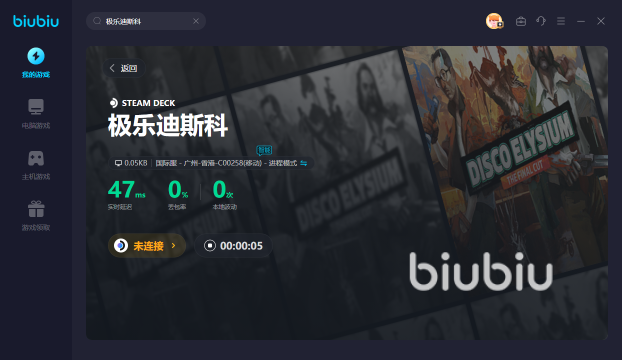 想要在biubiu里开启游戏加速也是再简单不过,就是先输入【极乐迪斯科】游戏名字,然后对应选择自己想玩的登录客户端,你会发现从游戏登录再到提供稳定加速其实就一分钟不到的时间,这也算是磨刀不误砍柴工,更何况速度还很快。