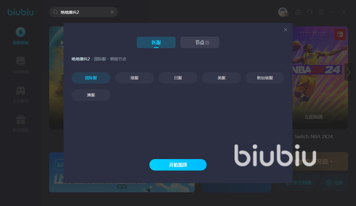 推荐biubiu给大家的主要原因,一是性能优异,第二就是福利非常丰厚,而且价格优惠。在加速性能方面已经实现了对网络优化和跨服结合在一起,可以根据自己需求去进行,选择选中相关选项后,直接点击就能连接。在运行过程中依靠自身云节点技术以及电竞及专线实现低延迟运行,无论是在国服还是国际服都是如此。在国际服选项中,现在比较火爆的美服,日服,澳服等都可以直接实现快速连接。加速该游戏之后,还能连带运行游戏的平台也同时进行加速,这样在使用方面更有效果。