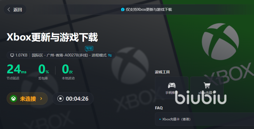 加速效果图也能很清楚地展示出当期的节点延迟以及xbox链接状态,同时在这个界面的右侧还有一些与xbox相关的游戏工具和FAQ,如果遇到一些设置相关的问题,可以在这里找到对应的解决办法。