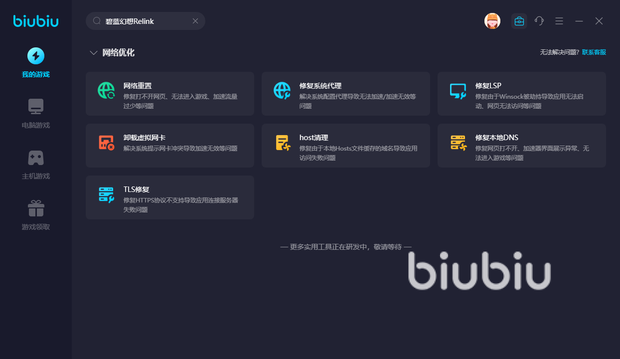 导致游戏掉线会发生在很多方面上,但基本就是围绕着网络、文件两个点,网络是因为Steam平台无可避免的,而文件问题对普通用户来说很难解决,可只要是来到了biubiu,就没有难解决的游戏问题,在右上角的工具箱内,就能看到原先需要超多复杂步骤才能解决的修复按键,且修复速度快到和连接一样,一秒钟的时间就能为你卸载虚拟显卡、清理内存、解决报错等等。