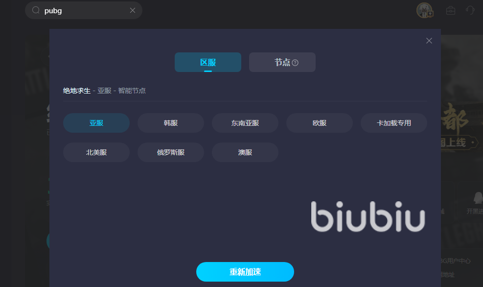 点击开始加速之后,如果是第一次玩,会自动跳进去选择区服的选项,可以看到国际版是提供多个区服选择的,大家喜欢哪个就喜欢哪个。节点也不知道选择什么的话,就交给biubiu的智能节点来决定吧。