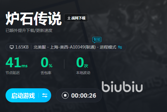 解决游戏卡顿的方法就是搭配biubiu来玩炉石传说,它启动简单,支持智能节点省时省力,只要一键加速就能获得流畅的网速。网速不仅快还很稳定,大家玩炉石就能一口气爬天梯或者在竞技场打到过瘾。