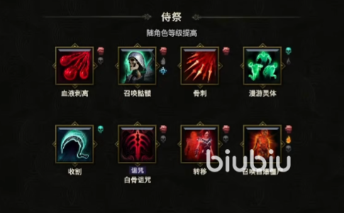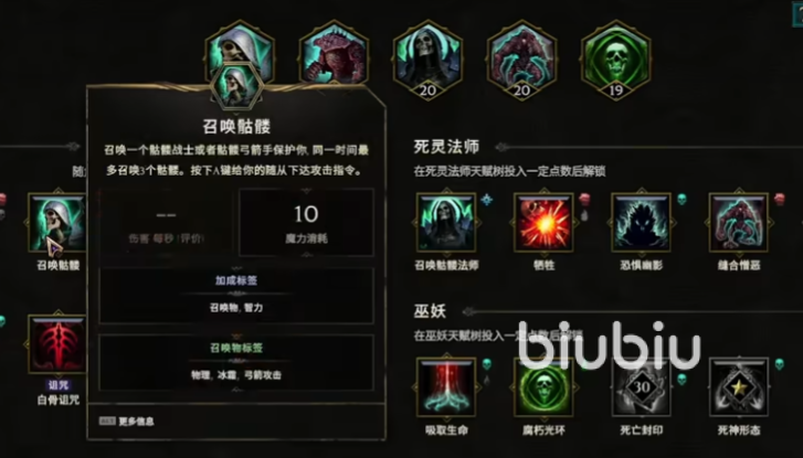 另外buff技能也不能低,灵魂跟心灵捕手能保证在骷髅死亡的时候还获得回血回蓝效果,这是一个很不错的续航技能,血线过低的时候用宝宝回复伤害。基地行者则是主动献祭宝宝,这样就可以利用死亡的骷髅增加副输出能力。