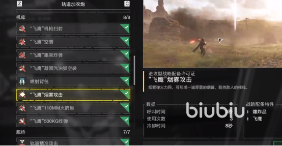 接着我们来看看最常用的飞鹰。第一个就是飞鹰空袭,第二个就是飞鹰110mm火箭巢,第三个是飞鹰500kg炸弹。首先飞鹰空袭是丢六颗可以破甲的炸弹,而且是可以拆毁建筑的。它的泛用性非常高,不仅可以清巢,而且可以把混在巢里的重装甲目标炸伤或炸毁。