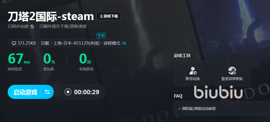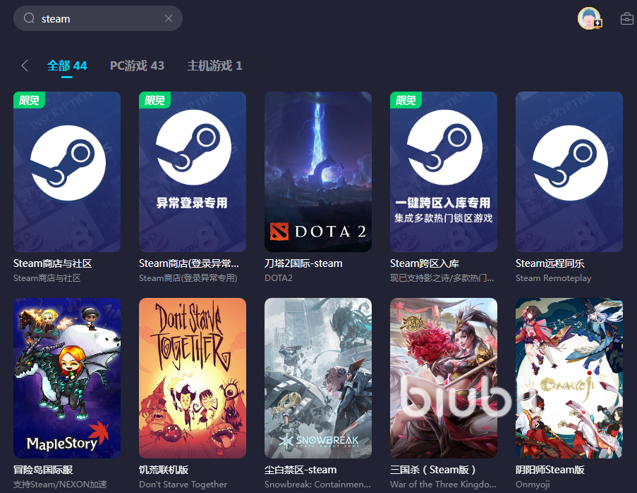biubiu支持多平台的多款游戏,游戏类型丰富,区服覆盖面也很广,大家经常玩的国服和海外服都能在里面找到,并且支持一键加速。在玩steam游戏的时候还能看到页面右侧显示一些游戏工具,比如账号切换、异常修复等,这些工具实用性很强,都是大家经常要用的,统一收录在biubiu页面大家在用的时候就不需要手忙脚乱地寻找了。