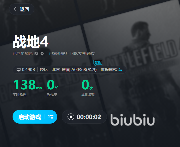 战地4自刚开始发售时就存在很严重的网络问题,经常要在游戏之前进行修复才能成功登录,不过现在很多加速器的加速系统就自带文件的完善,在biubiu内开启加速后就等于进入了独立的游戏服务器频道,在这个频道内仅限于biubiu的用户,再加上持续的高效数据加持,是能特别轻而易举完成低延迟登录游戏,而且在游戏过程中它还会保护你的稳定网络,不轻易地造成波动,将丢包率的数据可控在2%左右。