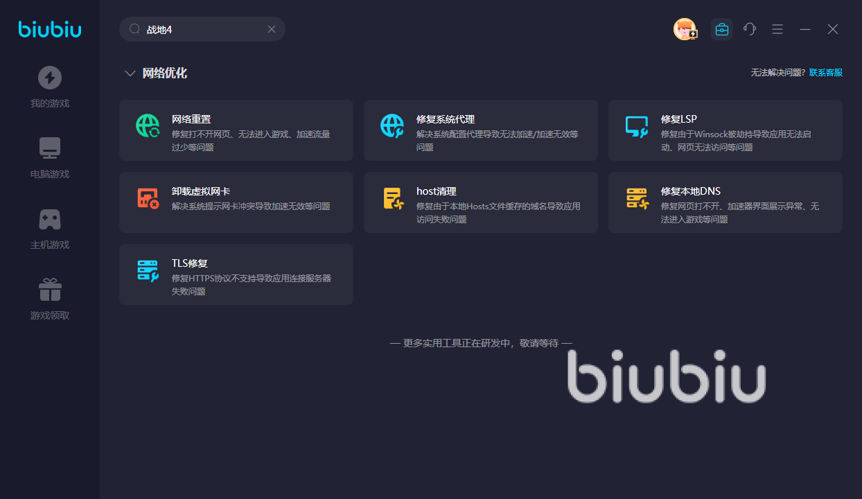 若是有了加速后还频繁闪退的话,就可以移步到biubiu内置的修复工具箱,工具箱内能修复的一些问题都是网络中显而易见的,也是在浏览器中许多玩家都会搜索的一些常见故障,就比如登录游戏弹出错误代码或是和虚拟显卡产生了冲突,但要想手动解决这些问题的话就得深入到电脑设置内去调整,可在biubiu里全部只是需要点击一下。