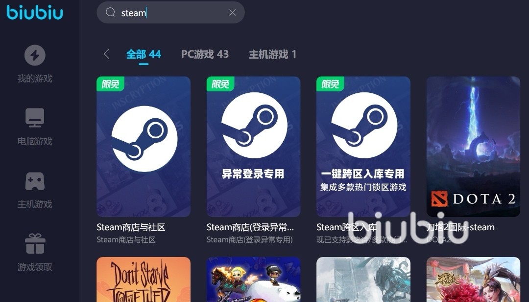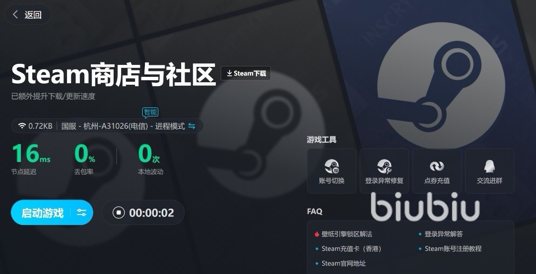 虽然它目前没有在biubiu中上线,但是游戏在STEAM中是可玩,刚好biubiu可以加速Steam,它支持多端游戏的加速,不仅可以加速Steam端游戏,还可以加速PC端等等,同时现阶段注册软件是有福利可领的,玩家作为新人进行首次注册的时候,是可以得到24小时的免费加速体验滴~如果觉得24小时太短,还可以用【biubiu不卡顿】的兑换码来领取3天的免费加速,后者是适用于新老玩家的,只是机会只有一次哟!