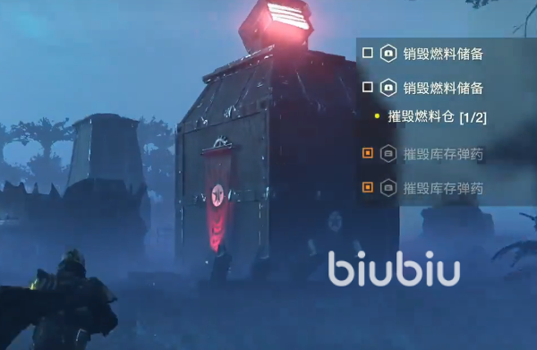 首先我们在战斗配备方面,优先选择飞鹰集束炸弹和轨道加特林火力网,主武器可以选择机枪。在我们落到星球上的时候便可以从右侧的任务提示中收到四个支线任务,分别是销毁两处的库存弹药和燃料储备,每一处的燃料储备都存在着两个燃料仓。这里小伙伴们可以优先选择降落的点在库存弹药目的地旁边,先将后面两个任务完成,完成后再分成两个小队,分别前往两处燃料储备的地方。