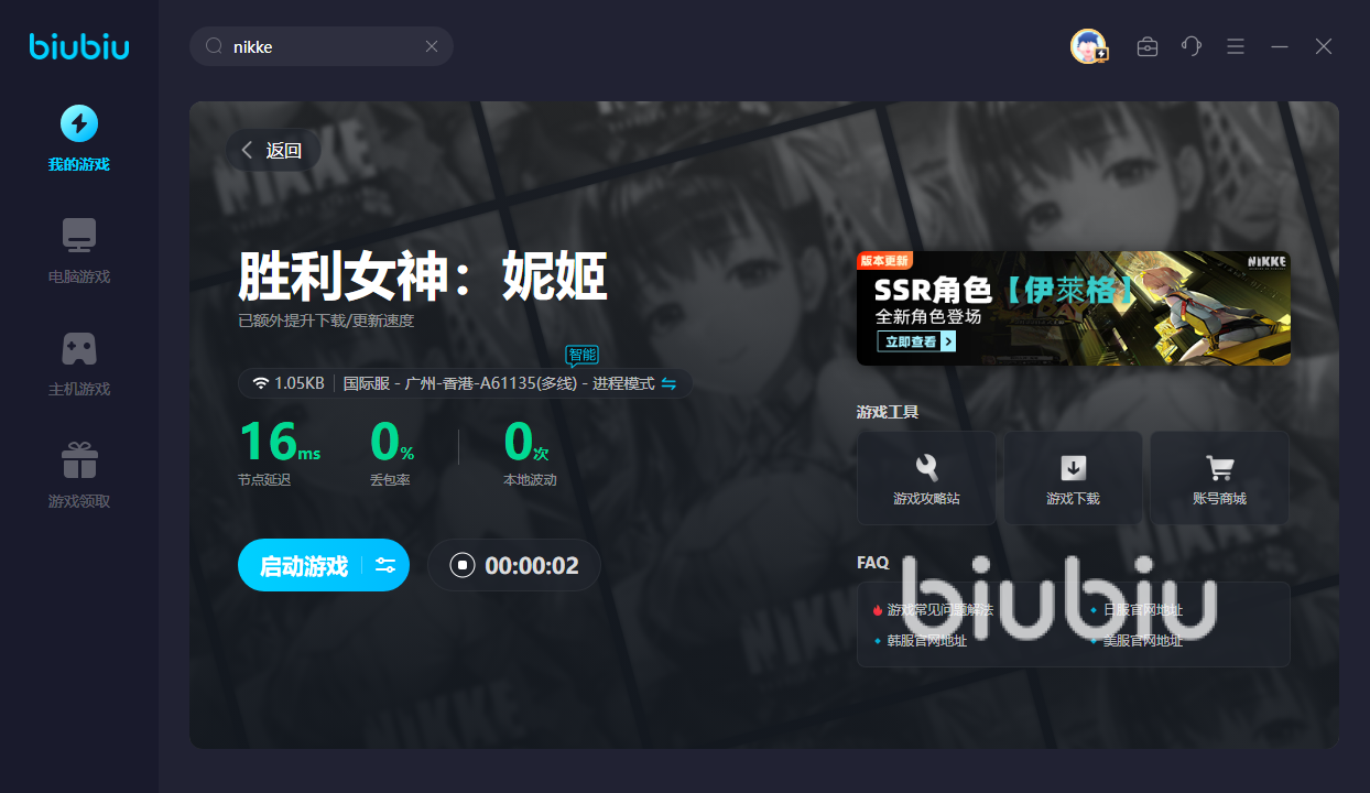 nikke作为热门游戏,时常会更新版本,nikke更新闪退怎么办?其实闪退最主要的问题还是网络不好,这时仅需用上biubiu,就能在极好地网域下快速更新游戏,从而防止更新途中就闪退,令你感到非常不舒服。