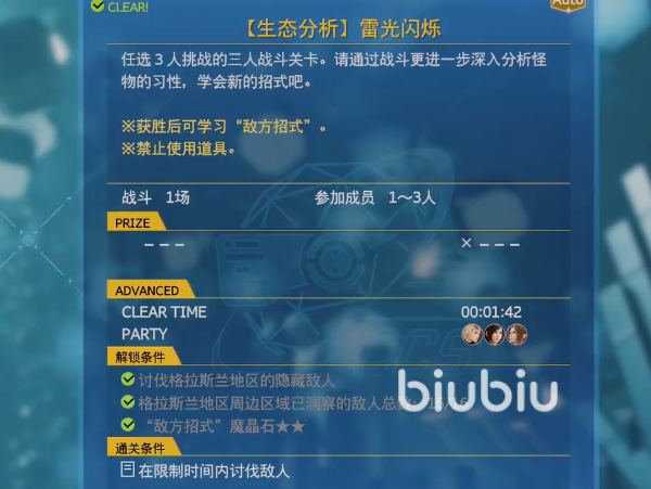 生态分析类任务则一般是,让我们在限定的时间内完成对敌人的讨伐,并且在获胜后有一定机率能学习到敌方的招式。因为生态分析类型的任务一般都禁止使用道具,所以我们在战斗前先准备好对应属性的魔法。比如雷光闪烁面对的则是我们在探索四个生命点之后解锁的隐藏BOSS,针对它我们所需要选择的魔法属性就是冰属性。并且在合理安排应对的角色人物后,我们尽可能地进行输出,争取在两分半中击杀掉这个BOSS即可顺利完成。