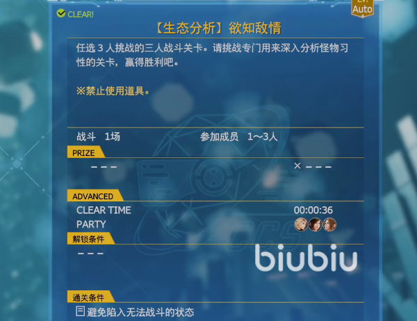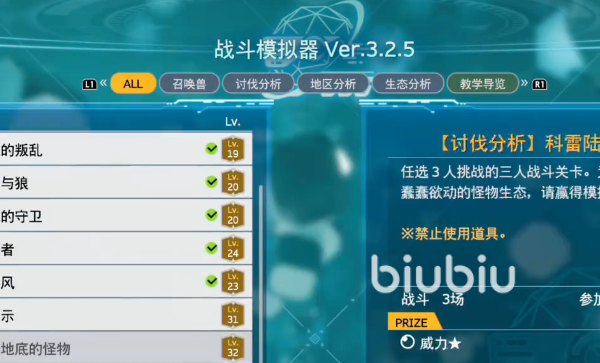 在战斗模拟器里面,我们可以看到总共五个方面的任务,分别是召唤兽、讨伐分析、地区分析、生态分析和教学导览。其中有关召唤兽的主要任务就单独一个,那就是任选三人的战斗关卡,在挑战传说巨人泰坦的任务中获得胜利。生态分析中则是需要我们挑战,专门用来深入分析怪物习性的关卡并取得胜利,并且在战斗中不能让角色陷入无法战斗的状态。例如欲知敌情的敌人是三只蝙蝠,它们拥有冲撞的技能,我们只需要在它们撞过来的时候,进行躲避即可顺利完成。