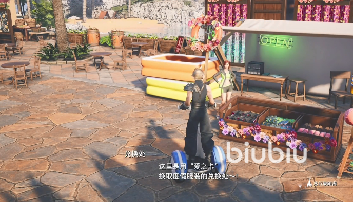 打开地图来到标记的度假服装兑换处,与NPC兑换就能换取新衣服了,严格来说在这里可以换的不仅仅是泳装,还能为自己或者同伴更换各种花里胡哨的衣服,只要你赢得了足够多的爱之卡,全部解锁也不是问题。