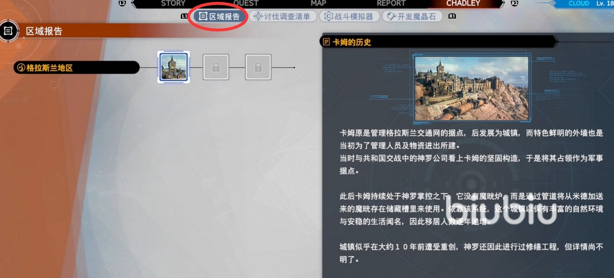 我们在调查生命点以后就会得到一份区域报告,比如格拉斯兰地区调查完就可以看到关于卡姆的历史。这里原本是一个交通网的据点,后面才慢慢发展成一个城镇,其中特色鲜明的外墙也是曾经的管理层出资建立的,简单来说这也是我们获取信息来源的一种方式。