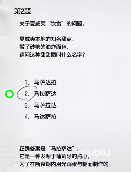 在夏威夷测验中被分为自然、文化、设施、地理和饮食这几方面,文化的题目有选择2024年关于威基基海滩正确的一项,在这里正确答案需要选择人工海滩。如果人们打招呼时竖起了大拇指和小拇指,那么这个手势被称为沙卡。饮食方面的问题有在夏威夷里面有一种油炸面包,撒了砂糖的它叫做马拉萨达,是夏威夷的知名甜品。