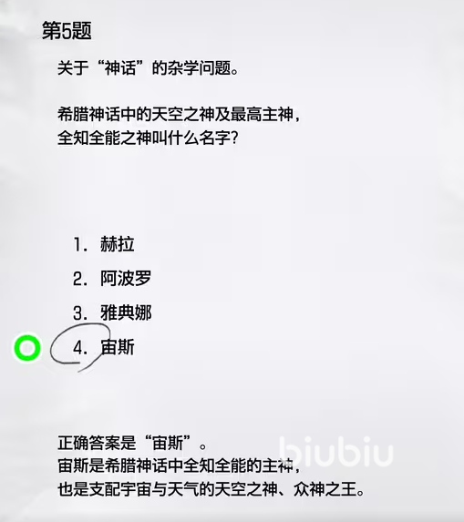 在杂学王这一测验中想要获得证书,需要懂得很多方面的知识。比如他会到写神话方面,让我们答出在希腊神话中不但是天空神,同时也是统领宇宙至高无上之神的名字,这里选择宙斯才能回答正确哦。在天体方面有可能会遇到让我们选择关于绕地球公转的月球正确的描述,其中自转与公转的周期一致才是正确答案。