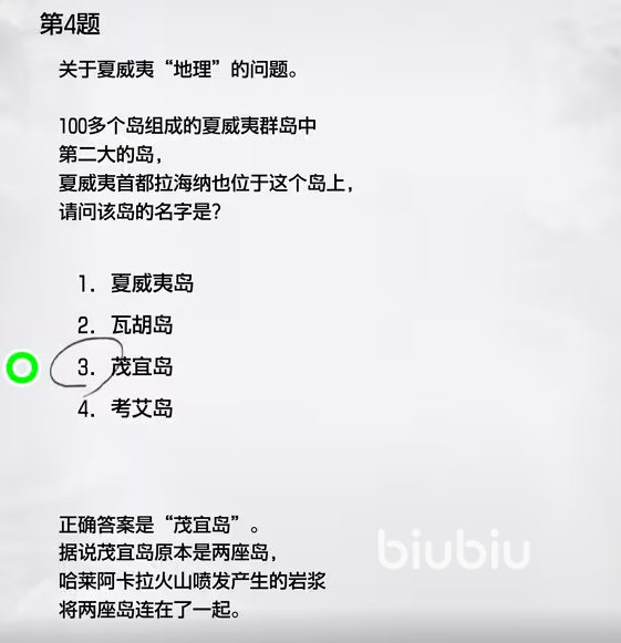 自然方面在当地语言里面,被称为雷阿希的火山中文名为钻石头山。设施题目有在茂纳凯亚火山顶附近,建立的观察设施类别为天体。地理题目则只有一个,那就是让我们选择出夏威群岛中的第二大岛,这里的正确答案是茂宜岛。在肌肉博士这一方面的测验中主要分为两方面,一个是力量训练,一个是肌肉。其中经常考到的适合健身人士食用而闻名的里肌肉属性哪一部位,这一道题就属于肌肉类型的测试,我们需要选择胸部。力量训练方面会问剧烈运动后如果出现肌肉酸痛如何处理,这里选择按摩疼痛的肌肉以其放松的选项。